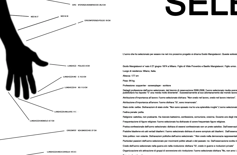 I selected a man during one of my live performances (Rotation White). I asked him to be myself in my next project. He accepted. The name of the selected man was Guido Mangialavori. Or Benedetta Panisson? The project is the result of five years of observation and study of the selected man (2005-2011). Rotation F to M is a sexual reassignment, a chaotic data archiving, the act of taking female and male identities out of the way, a malfunctioning mechanism, a love story. Rotation F to M began in 2005 with a double live performance, Rotation White, in occasion of the International Prize for Performance, Centrale di Fies, and Rotation Black (video-installation/performance), for a Trento's Galleria Civica di Arte Contemporanea exhibition, both curated by Marina Abramovic.